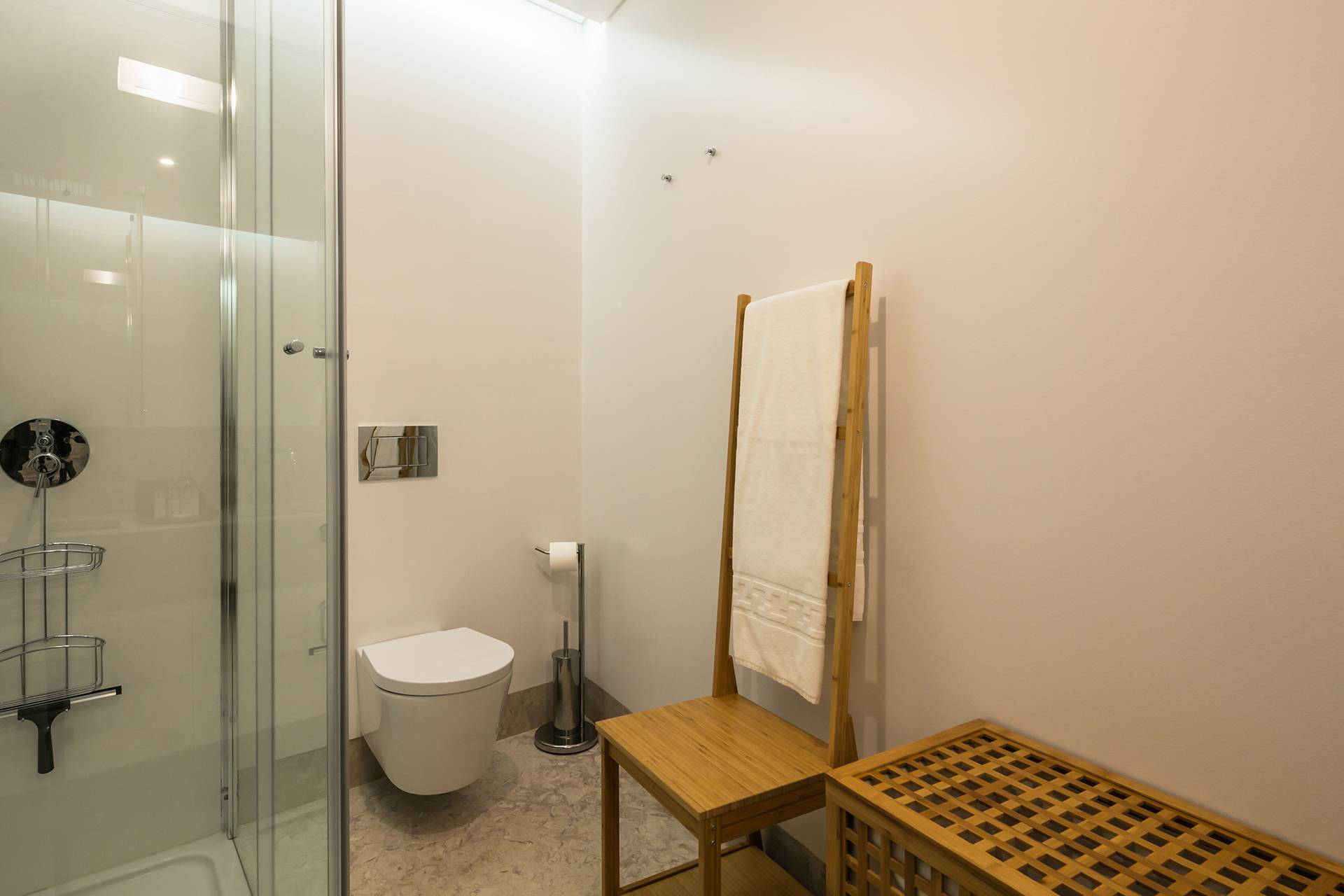 La salle de douche raffinée, en verre et marbre, se trouve au bout du couloir, à gauche de l'entrée, avant le salon.