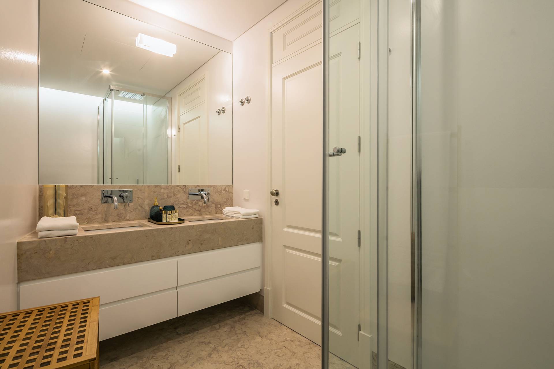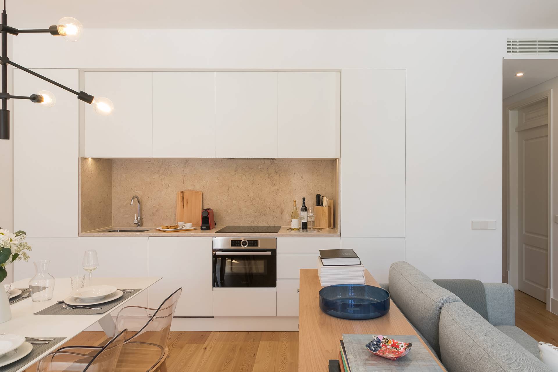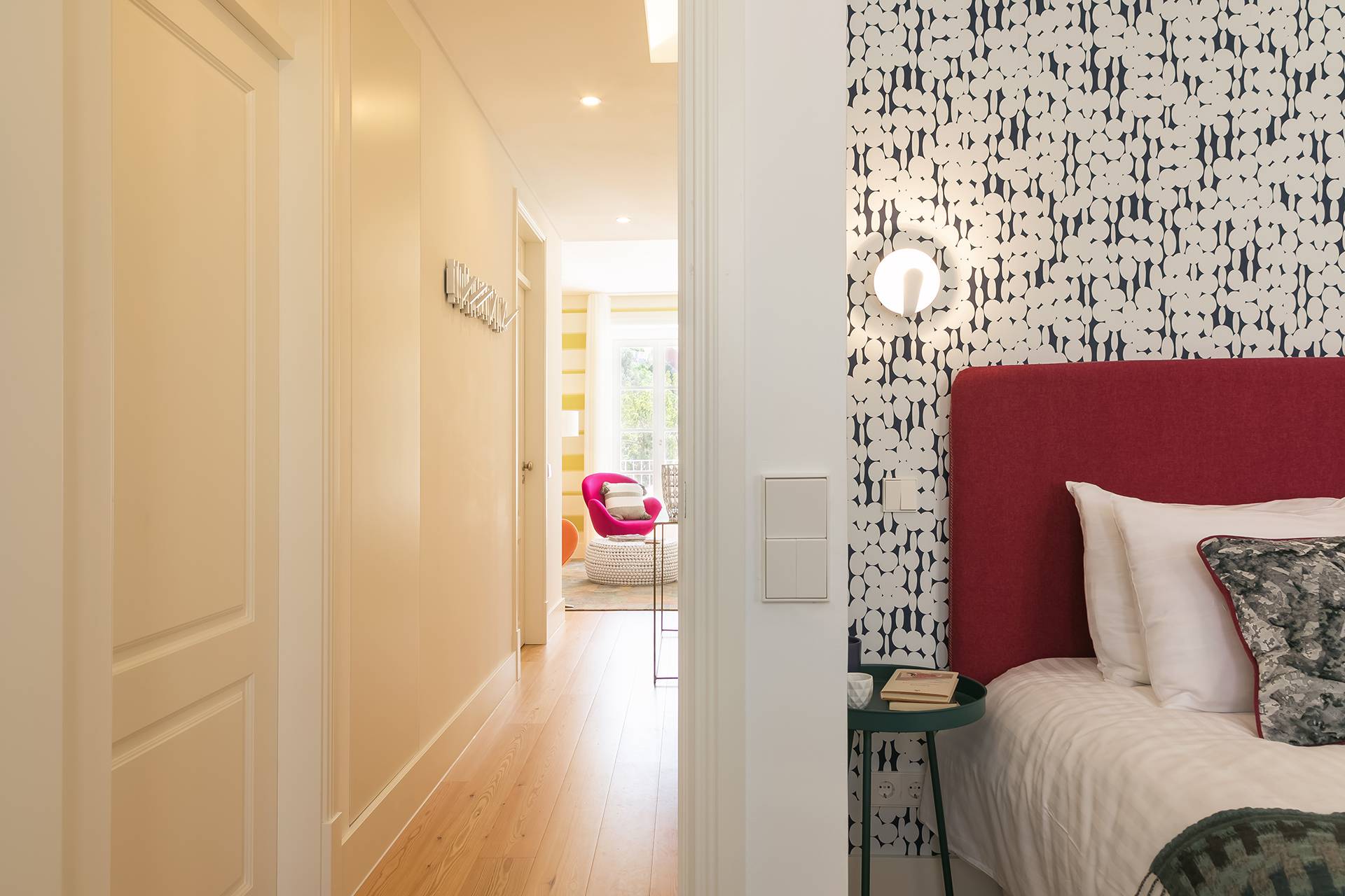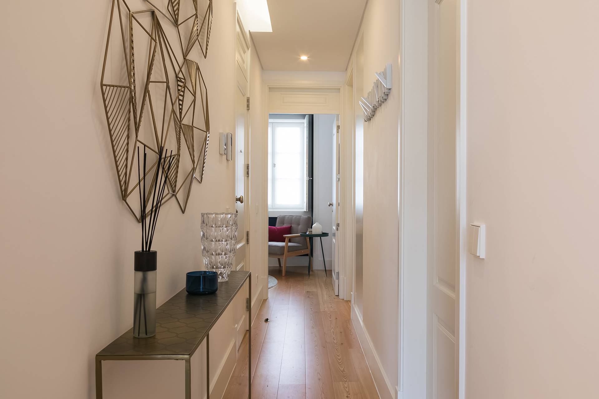 On entre dans cet appartement spacieux et élégant avec balcon à Lisbonne par un couloir qui donne à gauche sur deux chambres doubles, et à droite sur la grande pièce à vivre et le balcon.