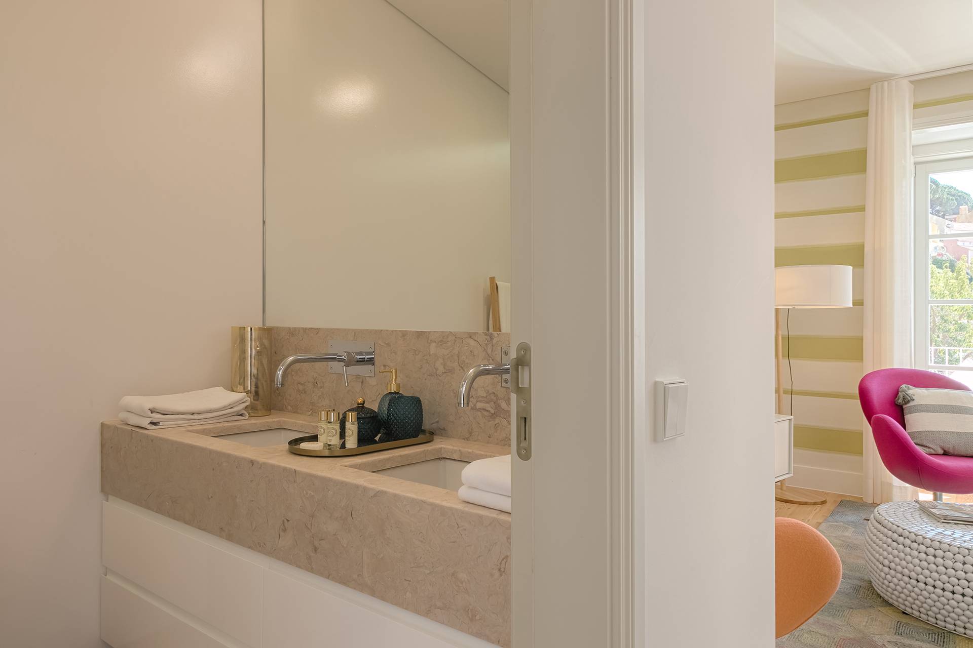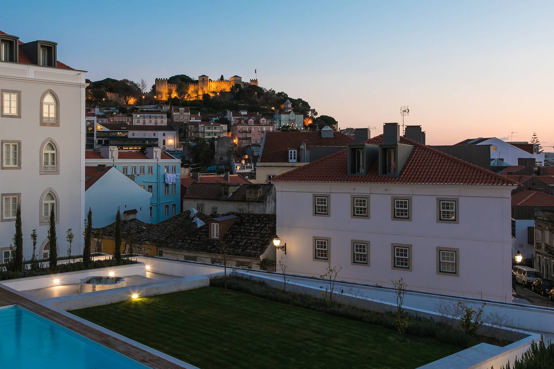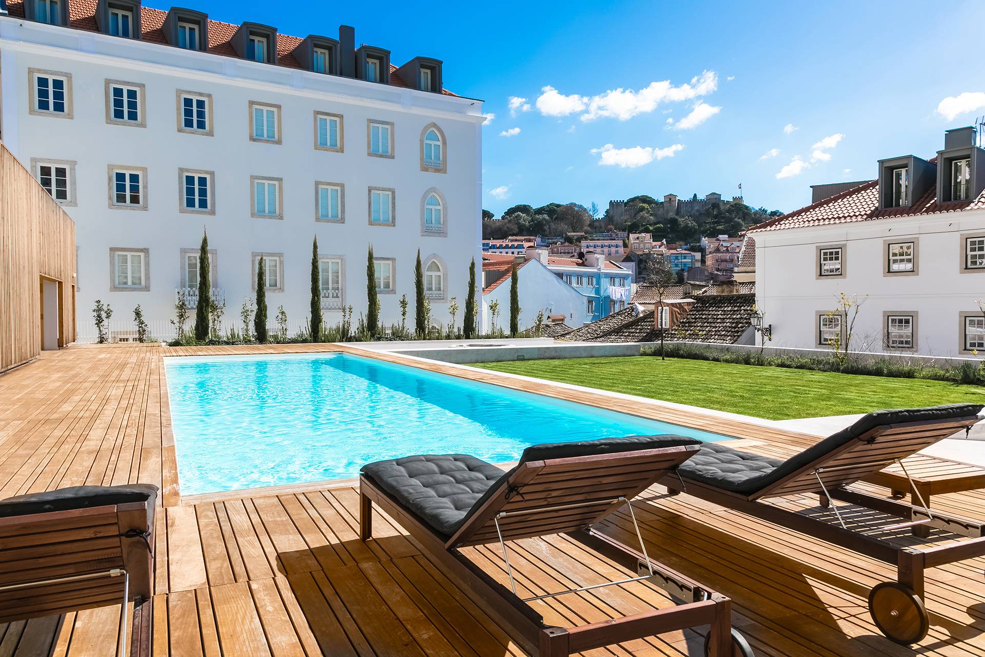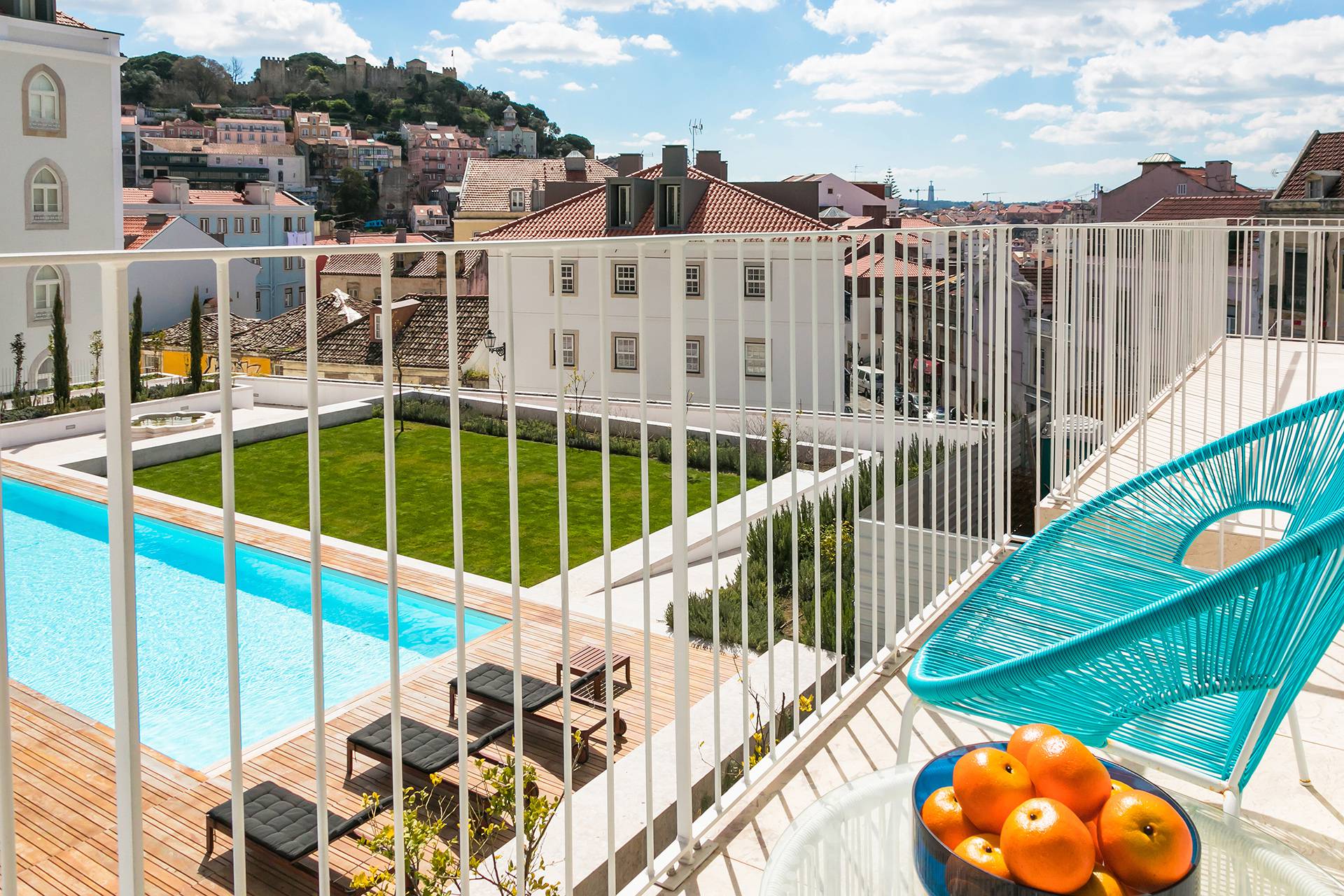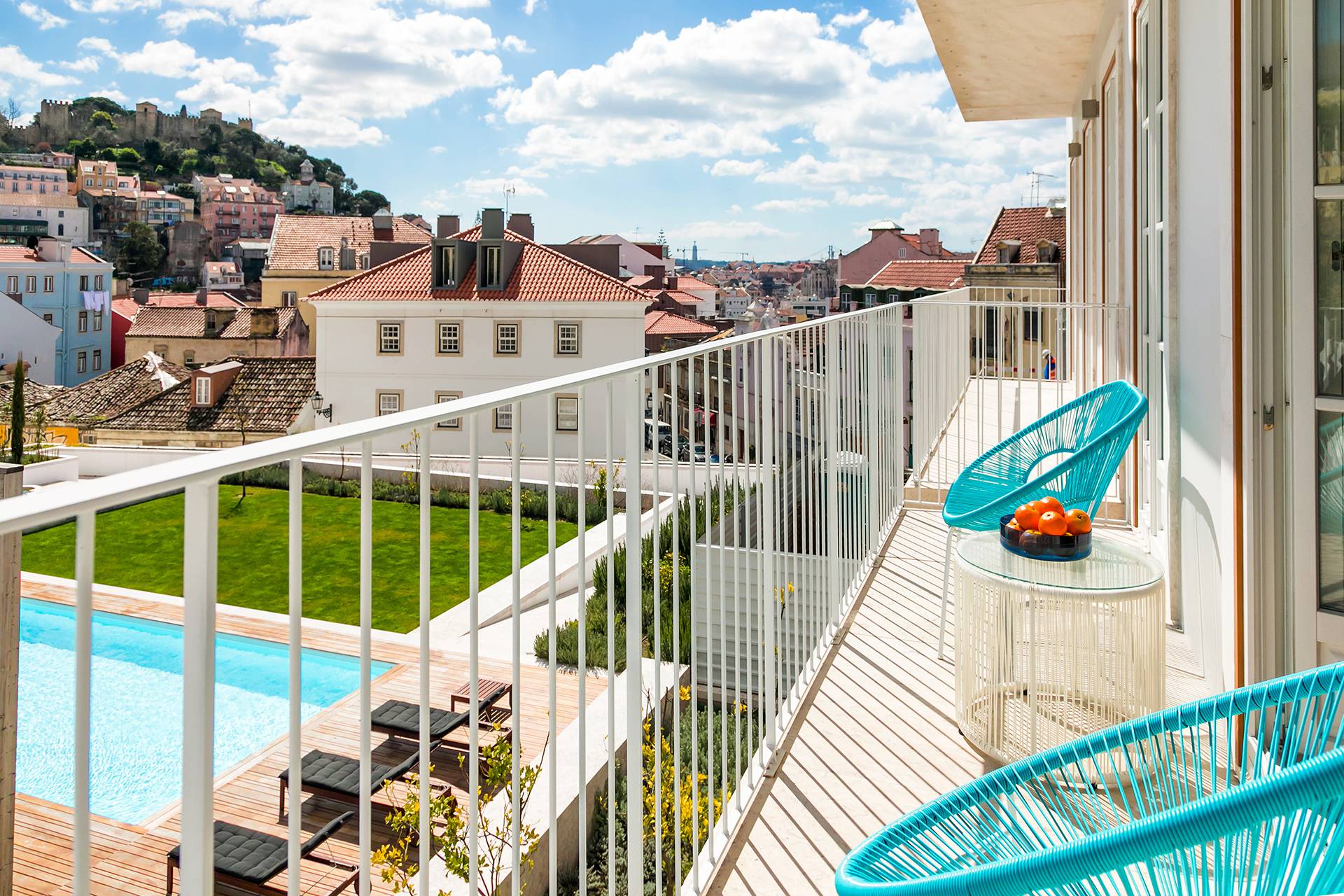 Depuis la pièce à vivre, on accède au balcon, qui surplombe la piscine et offre un panorama incroyable sur la ville et le château de São Jorge.